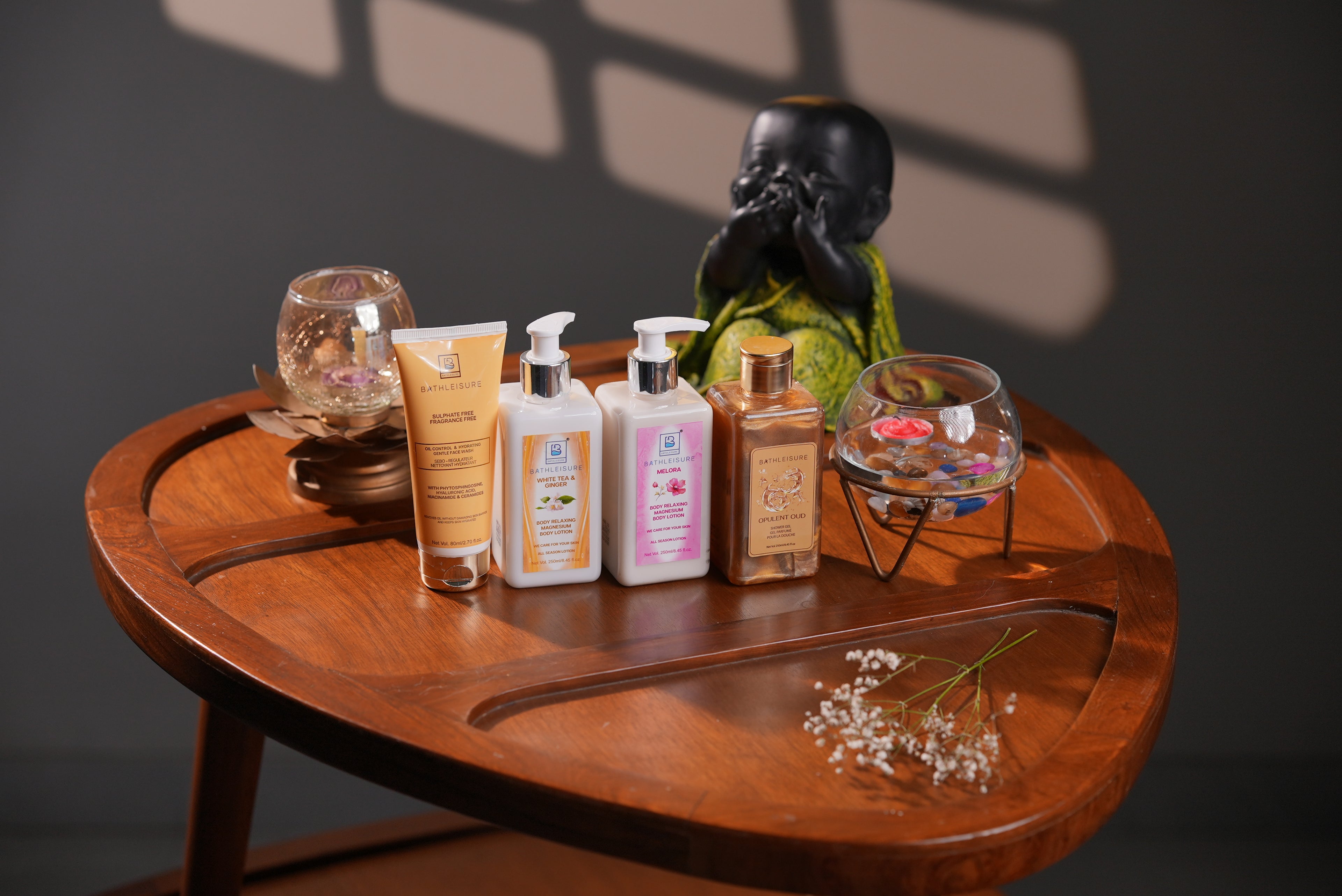 The Bathleisure Facewash, enriched with aloe vera and vitamin C, gently removes dirt and oil while keeping your skin hydrated. Our Shower Gel nourishes and refreshes, turning every bath into a moment of leisure.
